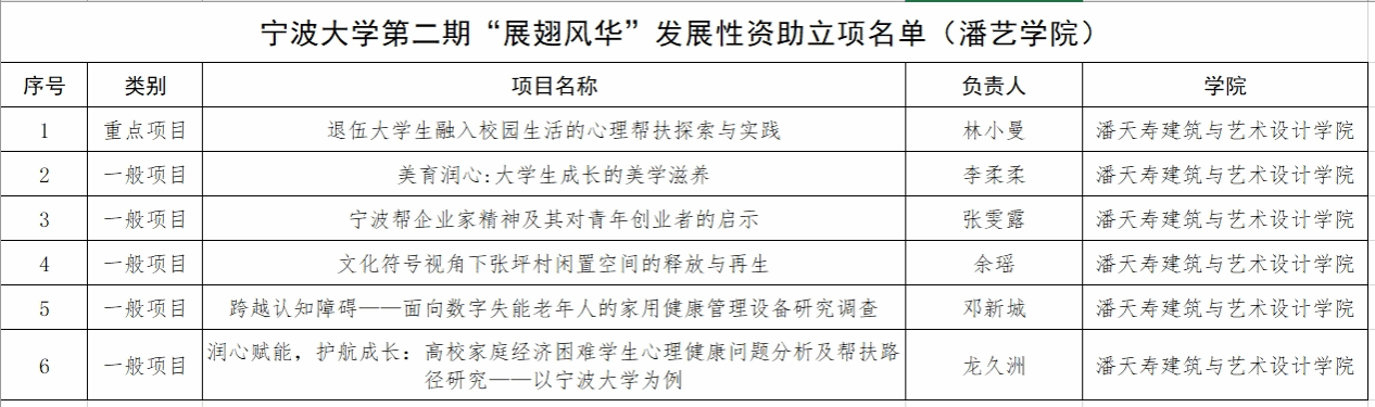 根据《利乐娱乐城网 本科学生资助工作实施办法》(宁大政〔2023〕 56号)和《关于申报第二“展翅风华”发展性资助项目通知》,经学生申报,所在利乐娱乐城网 、学生发展与服务处审核、专家评审等程序,最终评定出10项重点项目和87项一般项目(其中利乐娱乐城网 重点项目1项、一般项目5项)。