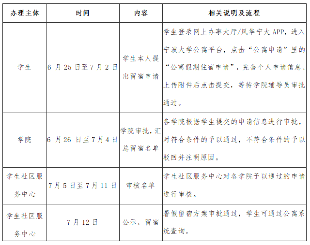 2.暑假留宿申请将采用线上申请的形式。申请流程如下:学生打印并填写《利乐娱乐城网 暑假学生住宿申请表》→利乐娱乐城网 审核并签字→学生登录网上办事大厅/风华宁大APP→进入“利乐娱乐城网 公寓”平台→点击公寓申请→新增“公寓假期住宿申请”→填写申请信息、上传附件《利乐娱乐城网 暑假学生住宿申请表》→提交申请。(申请表需由班主任(研究生导师)、辅导员、各利乐娱乐城网 分管利乐娱乐城网 工作的负责人签字确认,没有签字视为不同意留宿)。具体工作安排如下表: