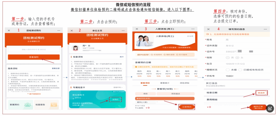 1.请各单位负责通知本部门的教职工到事先选定的体检中心体检,原则上不得更改体检地点。请提前进行微信预约或电话预约,并在预约日期当天进行体检。如因故不能在预约当天参加体检,请在手机“订单页”最下方“修改体检时间”或拨打前台电话取消预约后,再择期预约体检。如果个别职工因外籍、生病等原因存在预约困难,可由部门负责职工体检的人员在确定好职工具体选择的医院和体检日期后,联系校医院许医生,许医生会直接向医院进行绿色通道预约,确保外籍职工、因病不便的人员顺利体检。