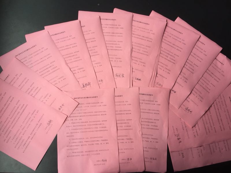 召开全体毕业生党员大会,毕业生党员重温入党誓词,再次学习了党章,并签订了廉洁从业承诺书。