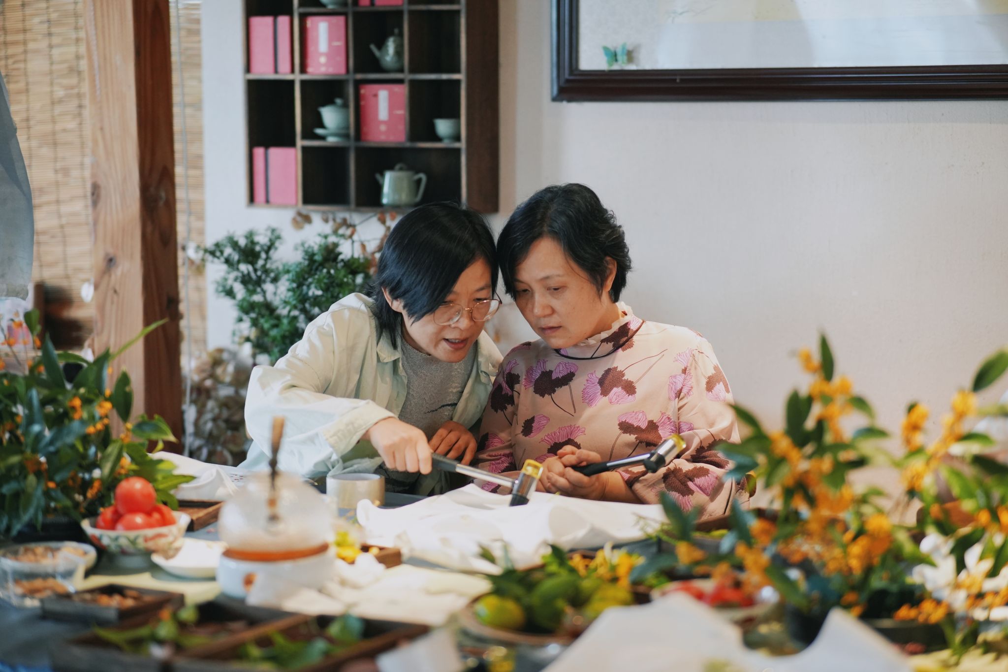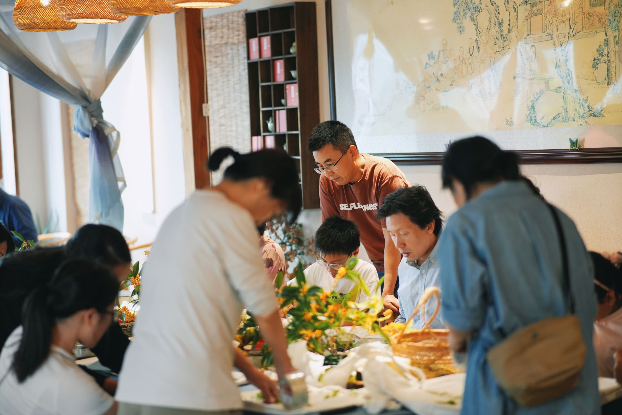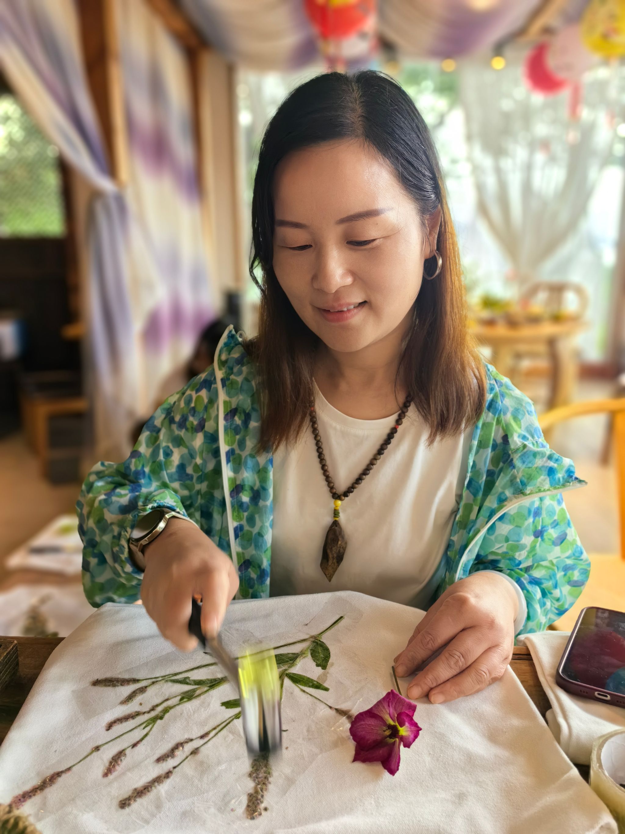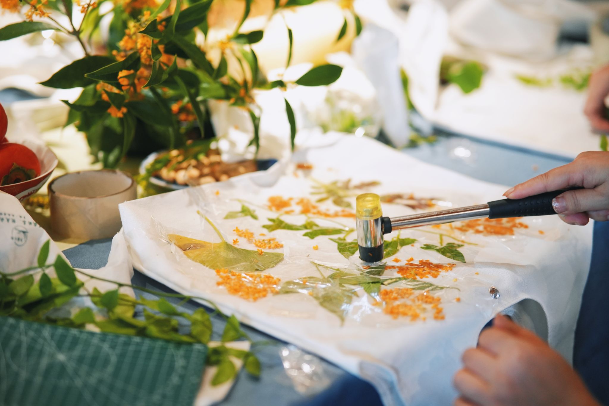 稍事休整后,下午的活动转向了非遗文化的体验,老师们在专业老师的指导与带领下参与了植物拓印的非遗工坊,大家学习了如何选择适合的植物,运用拓印技法,将自然的美丽呈现在布袋上,与秋天的草木进行一场指尖的对话。每个人都认真投入,细心操作,创作出一件件独具特色的艺术作品。
