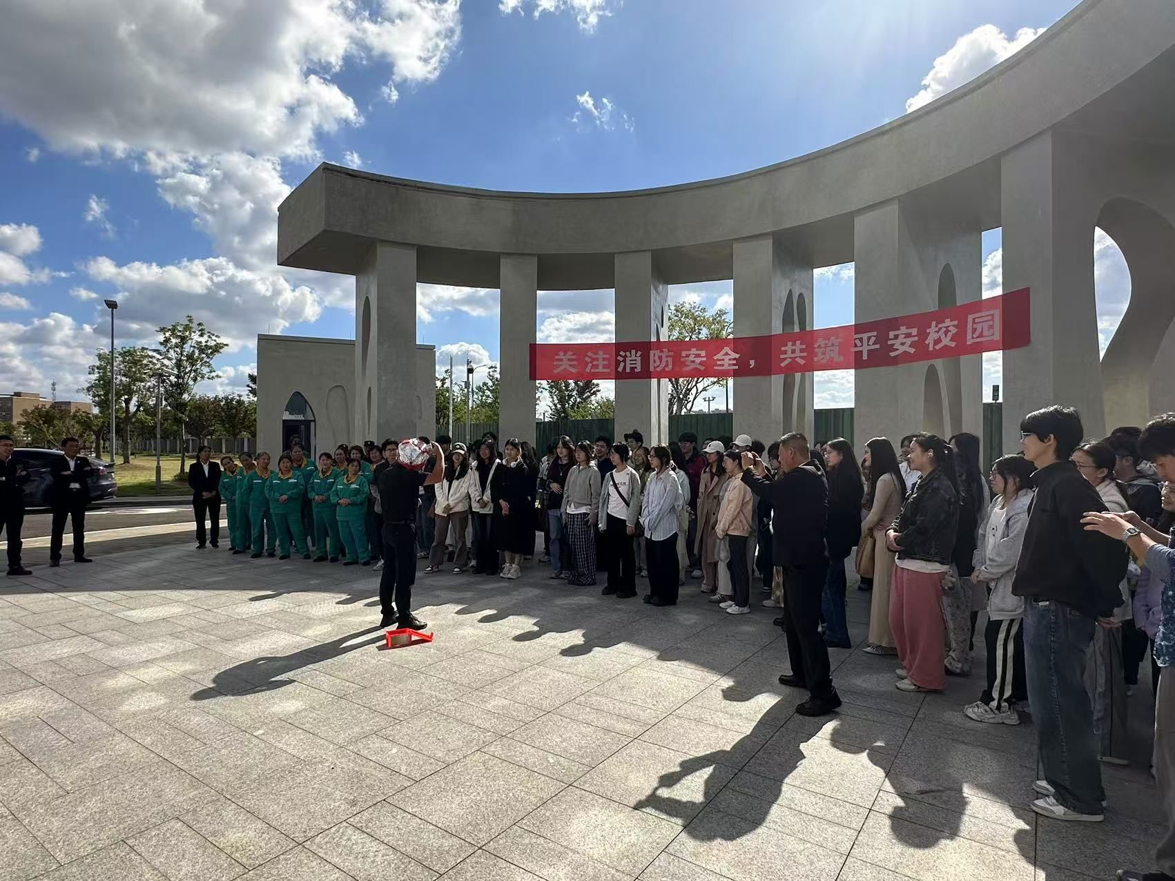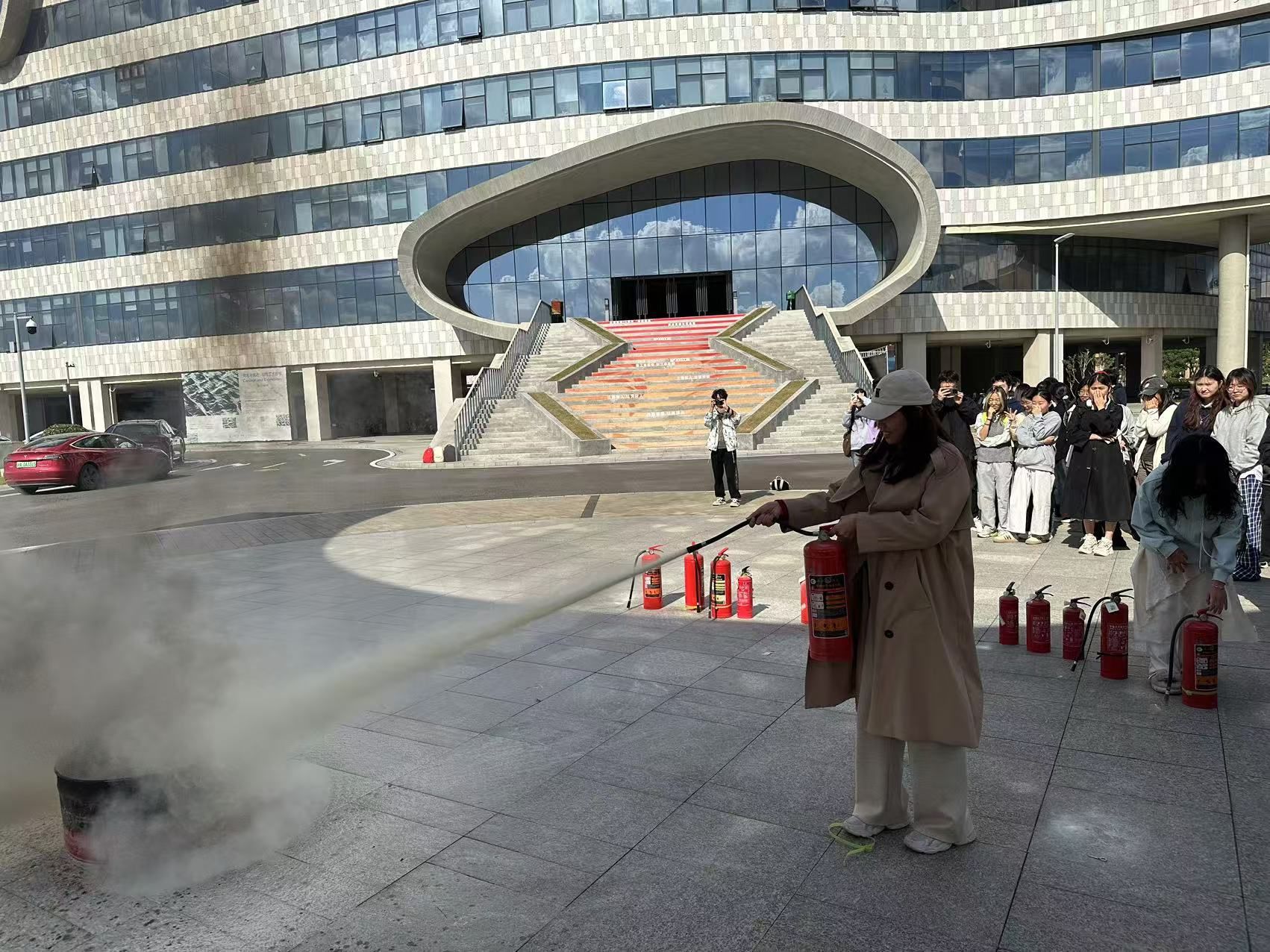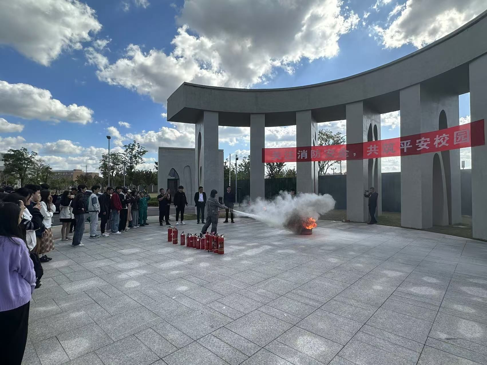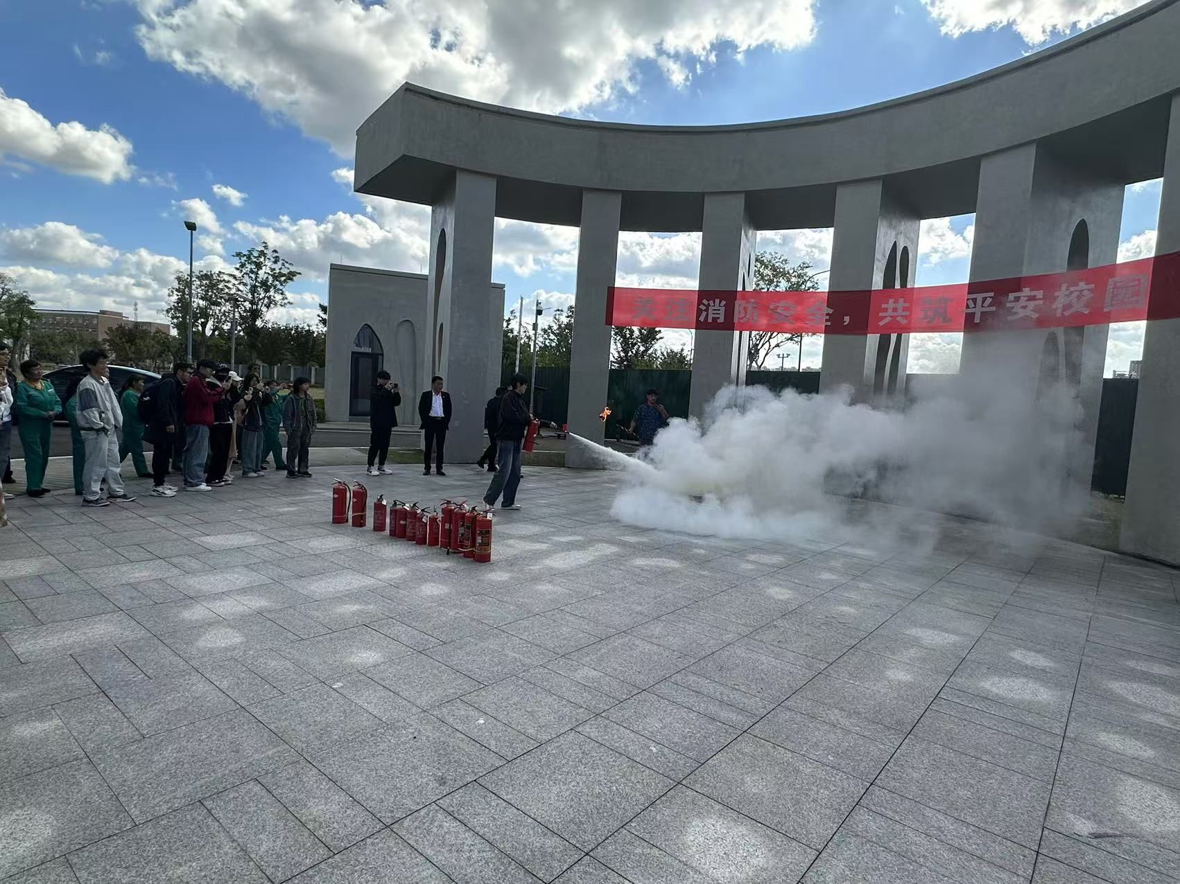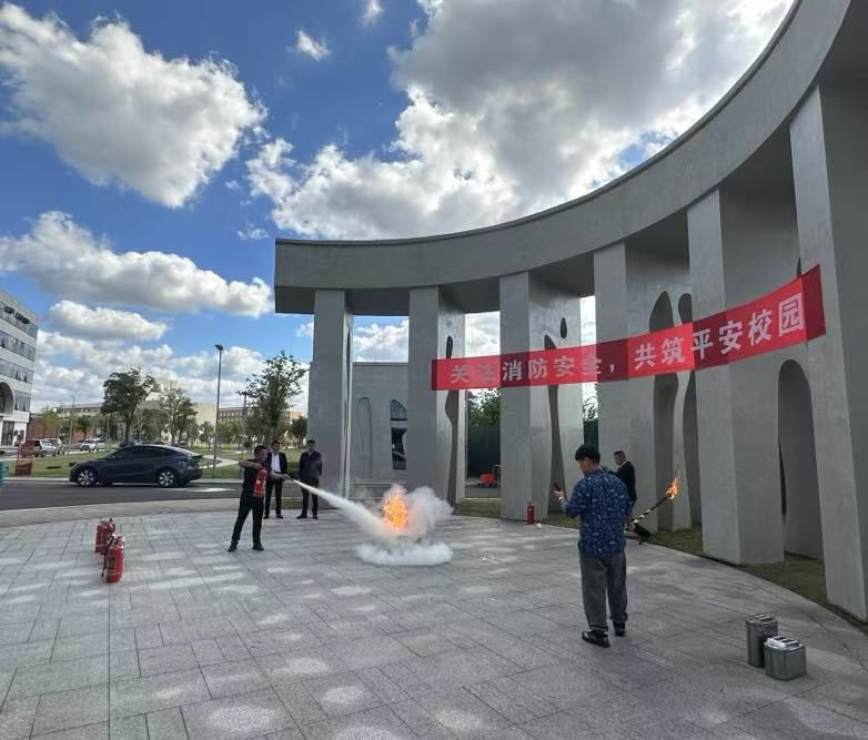 教学楼大台阶前的空地开展了消防演习活动。活动演练了小型火场发生的处理情境,参加活动的师生员工依次手持灭火器,拔掉灭火器安全栓,在上风向对准火源根部,迅速将火扑灭,亲身体验了消防灭火的全过程。针对灭火器使用不规范的问题,郑老师也进行了现场指导。整场演习有条不紊、井然有序。