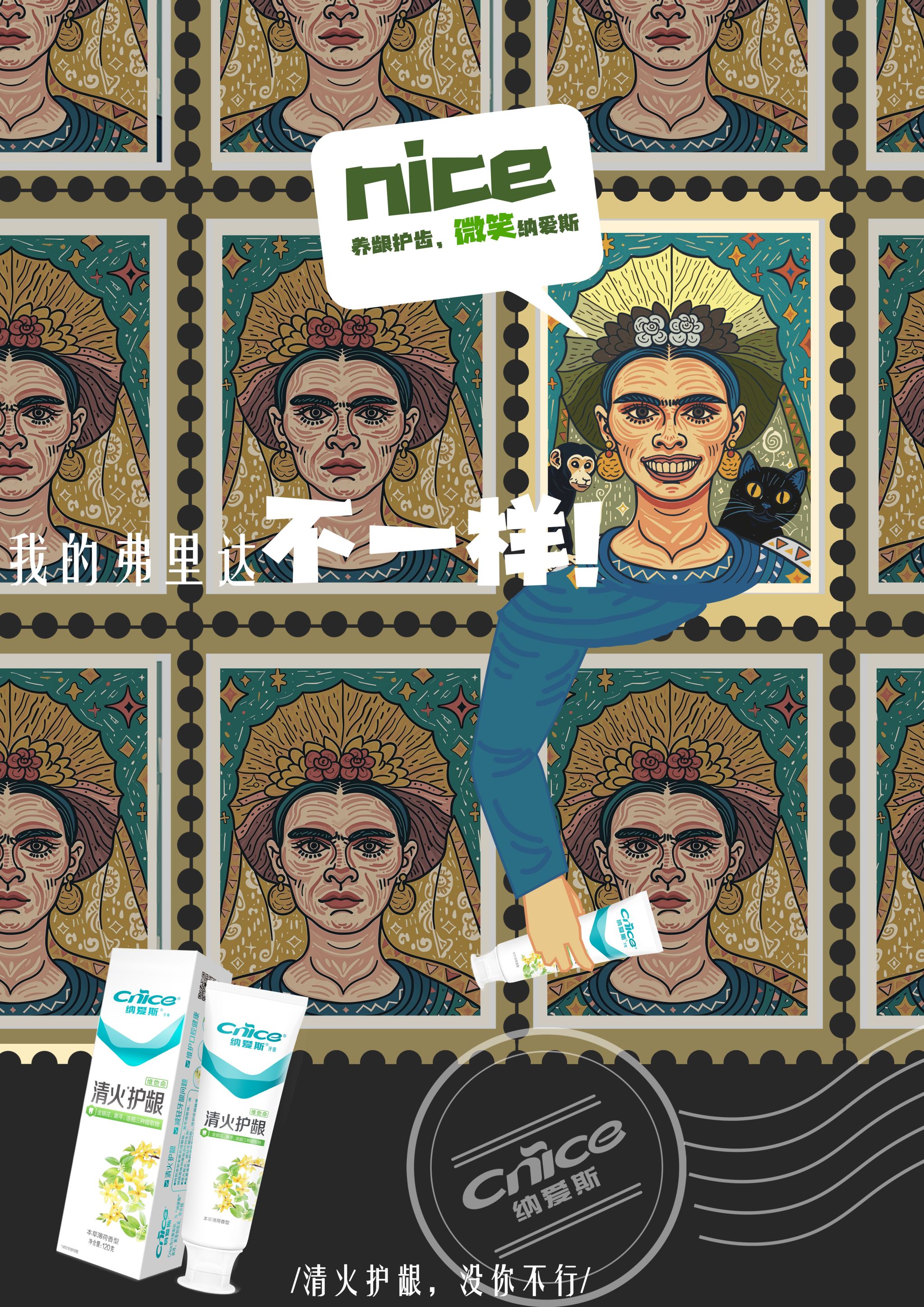最后,我们做了细节方面的调整,如邮票边框与类似装裱画框造型的调整、胶卷配色边框与邮戳装饰,丰富画面,强调产品名;特异部分人物增加握牙膏的手臂,体现“名人”“药膏”“微笑”之间的关系;增加“对话框”和“我的XX不一样”“清火护龈,没你不行”等标语。