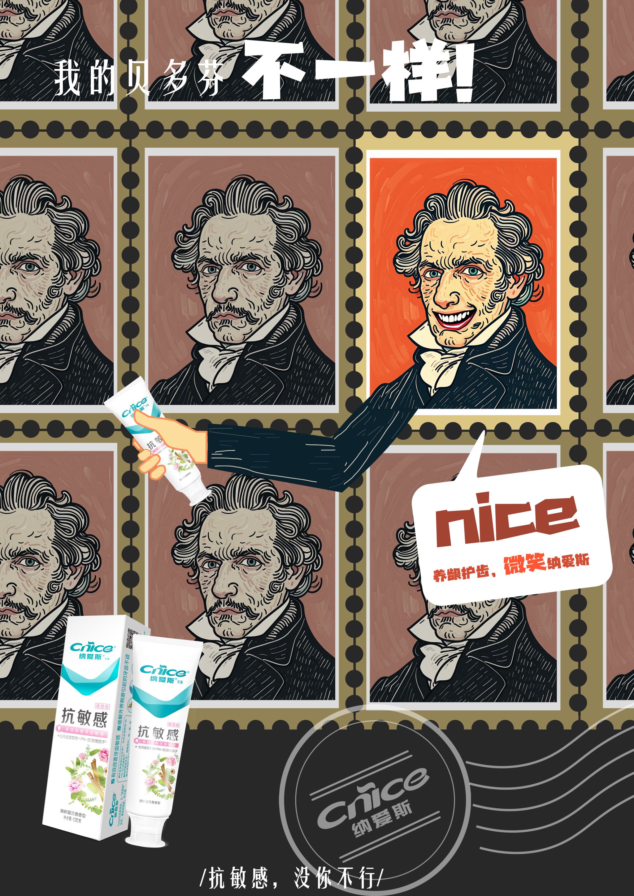 在深入构思的过程中,我们挑选了身份与知名度合适的三名艺术家,他们的共同特性是形象严肃、身世凄惨,我们将他们的自画像画框重复拼接,特异唯一一个画像中人物从画框中伸出手拿到纳爱斯,露出洁白的牙齿和笑容。
