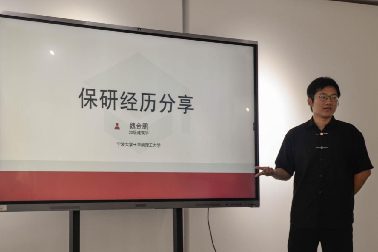 的研支团队伍。2020级建筑学专业魏金鹏同学分享了大学的学习经历以及保研经验。魏金鹏同学指出,要培养学习的专注力,做好短期中期长期规划,按照规划一步一个脚印坚持下去,最后自然能水到渠成。