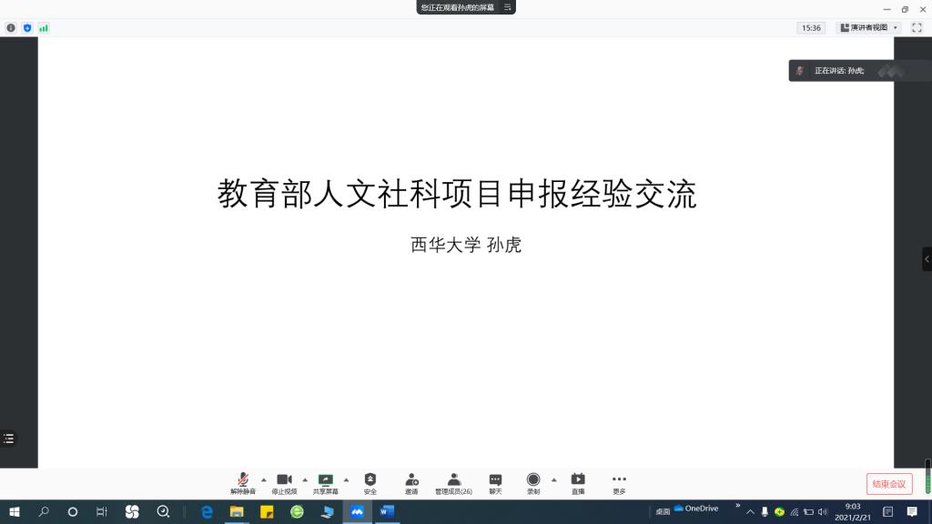 2021年2月21日,利乐娱乐城网 邀请西华大学美术与设计利乐娱乐城网 孙虎教授作教育部人文社科项目经验交流。孙虎教授结合自己研究经历与大家分享了科研选题与申报书撰写的经验,利乐娱乐城网 教师和研究生参加了会议。
