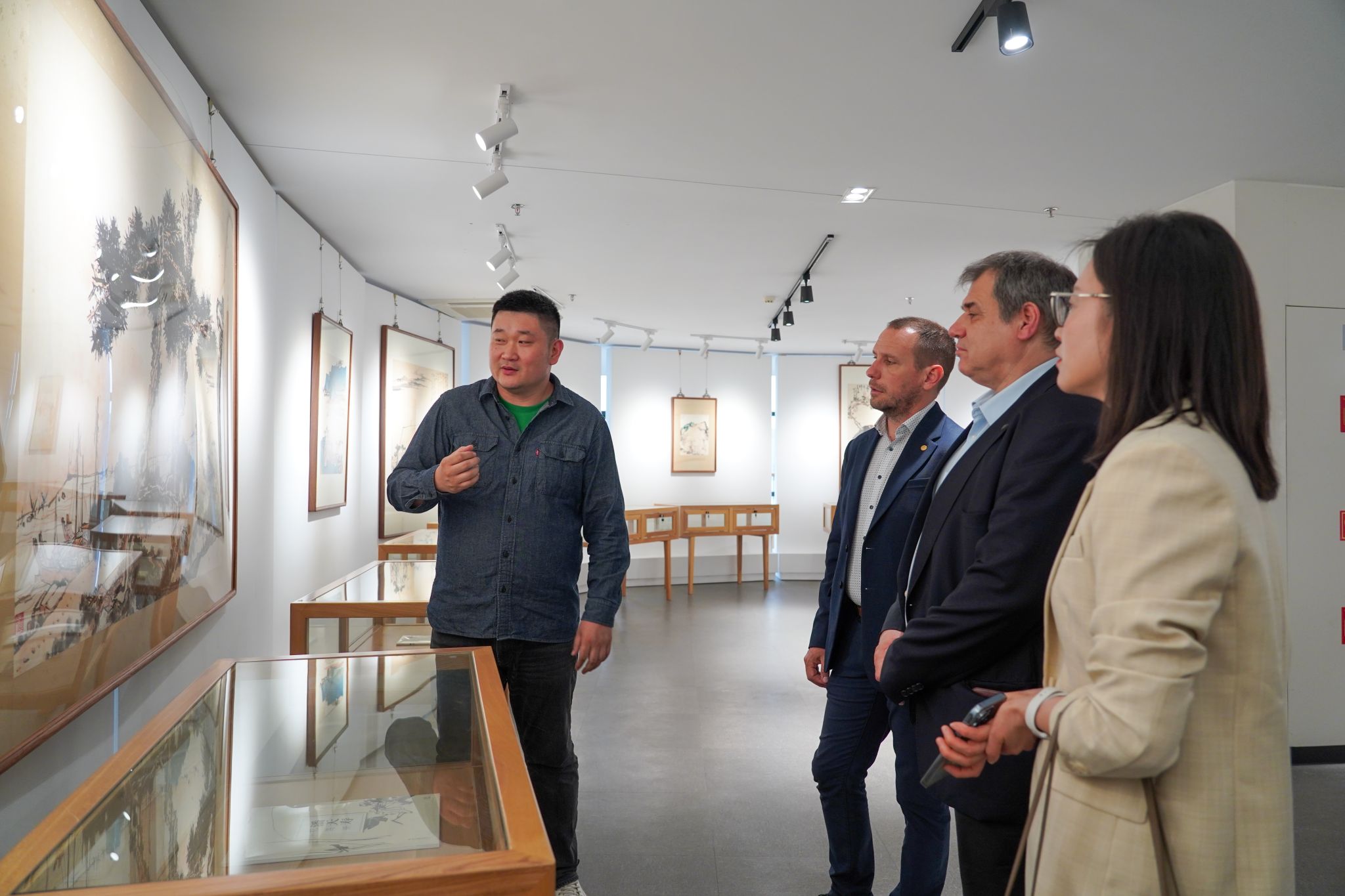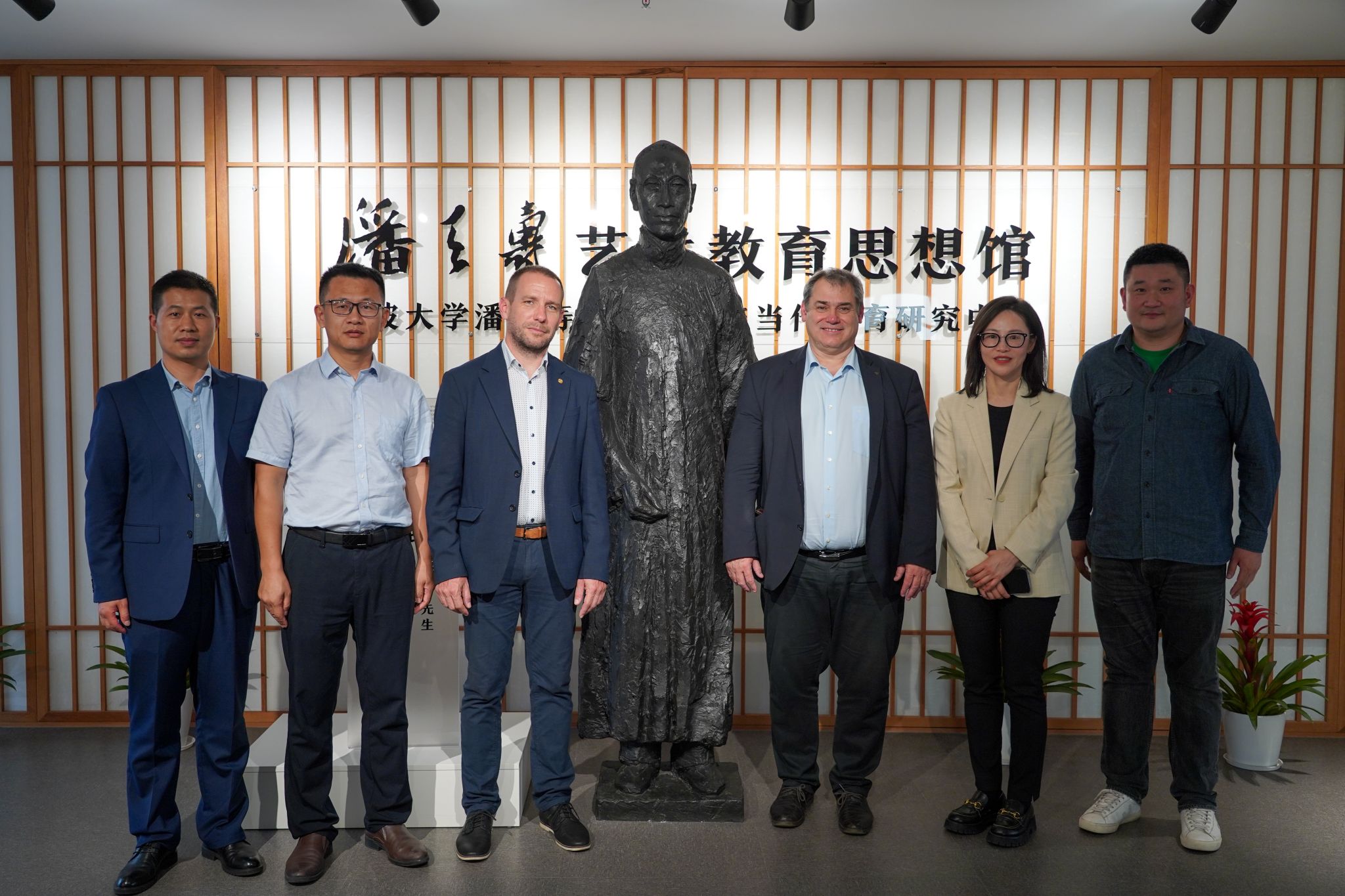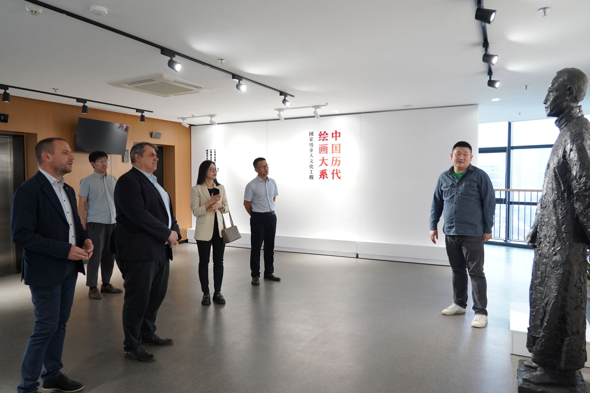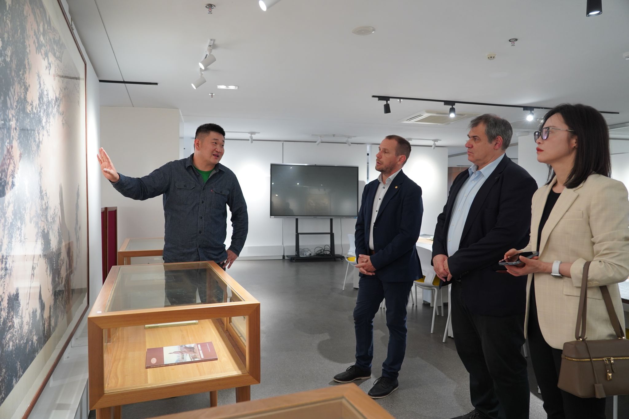 9楼的潘天寿艺术教育思想馆。王院长向客人详细介绍了中国近现代艺术大师潘天寿先生的生平事迹、艺术成就及其教育理念,并重点讲解了馆内珍藏的潘天寿经典作品。代表团成员对潘天寿先生“中西融合、传承创新”的艺术思想表现出浓厚兴趣,并就中国书画艺术的独特魅力与王院长进行了交流。随后,代表团参观了学院收藏的《中国历代绘画大系》部分经典作品。Hamar Imre副校长高度赞赏这一国家级文化工程的价值,认为它不仅展现了中国传统绘画的博大精深,也为国际学者研究中华艺术提供了宝贵资源。Bartus David院长表示,罗兰大学文利乐娱乐城网