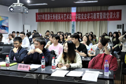 党委书记徐一萍老师、党委副书记刘秉印老师、美术系教工党支部书记马善程老师、学生第一党支部书记陈颖老师、学生第二党支部书记蔡黎明老师担任评委。选手们以ppt或视频的形式,讲述包括党史学习、英雄事迹介绍、乡村振兴、脱贫攻坚等故事,内容丰富,角度新颖,选手们精神饱满,在场评委老师和观众们也是深受感动与鼓舞。