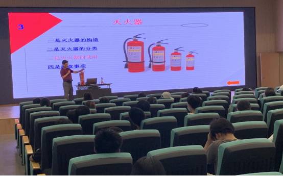 徐老师结合自己丰富的工作经验,首先通过展示火灾现场的照片,告诉同学们安全的警钟必须长鸣。接着,徐老师结合火灾案例分享、消防设备介绍、灭火器使用等环节,从强化消防意识、提高消防技能、日常消防安全防范三个部分,为大家做了生动阐述和介绍,与同学们互动良好。最后,徐老师强调,只要大家有较强的消防安全意识,提高报警、灭火和逃生等消防技能,做好日常消防安全防范,就一定能避免和减少火灾的发生,确保消防安全。