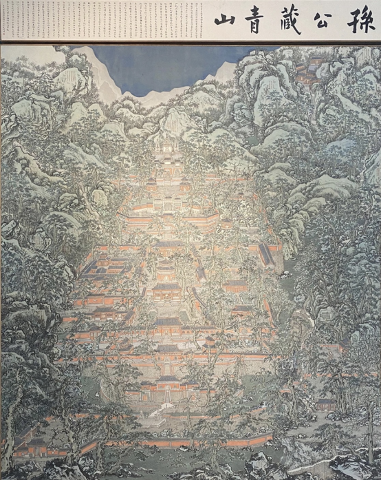 这幅作品主要用俯瞰视角描绘了山中寺院的格局与景色,笔法筋道而色彩典雅。