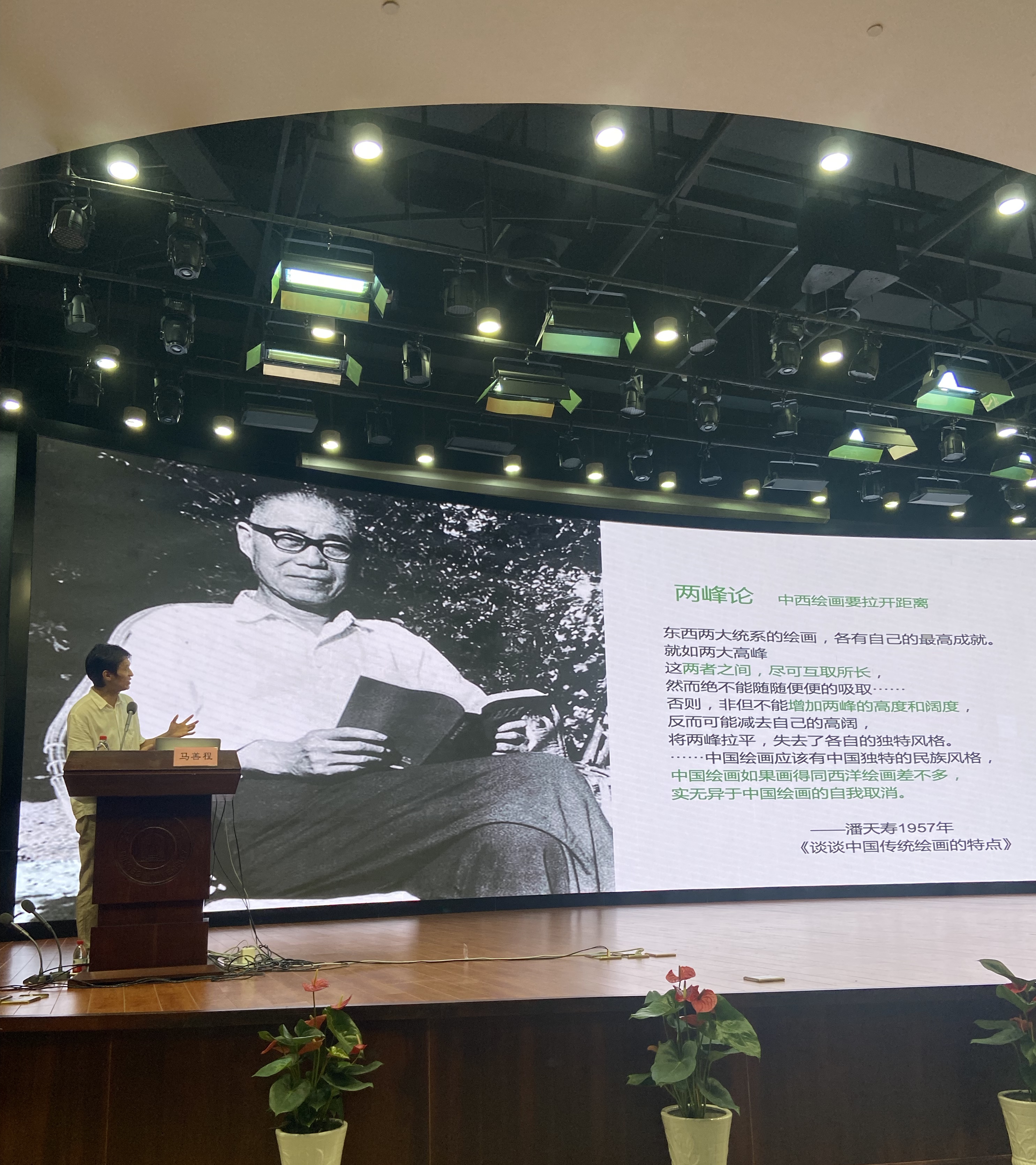 讲座现场,马老师借用丰富的图文、视频资料,讲述了潘天寿先生卓尔不凡的一生和历劫未泯的风骨道统,并指出潘先生潜心传统又无惧拓新的艺术精神,在如今呈现多维特征的文艺新时代应声而起,也恰恰回应了中华民族的文化自信和复兴梦想。之后,马老师又带领大家一起走进书画大家潘天寿的艺术世界,观其诗、书、画、印之精华,看其承传之“常”,赏其应时之“变”,共同领略“常变之道”。