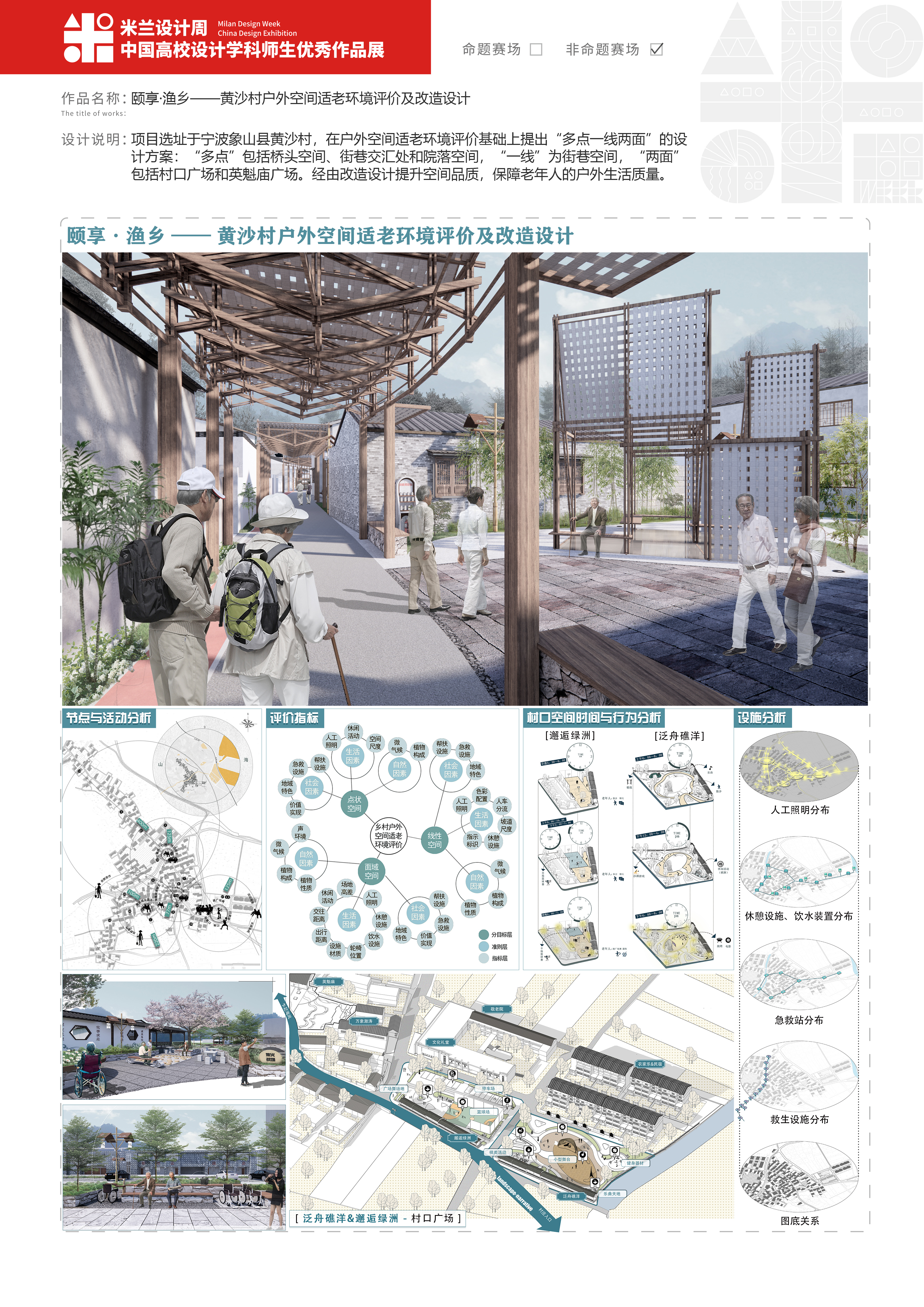 陶锋、包伊玲老师指导,张津豪、唐洁创作的《颐享·渔乡——黄沙村户外空间适老环境评价及改造设计》,王世学、金壮老师指导,周梦欣、孙绎然、屠慧楠创作的《“四方”集市》在全国总决赛中获得了一等奖的好成绩。