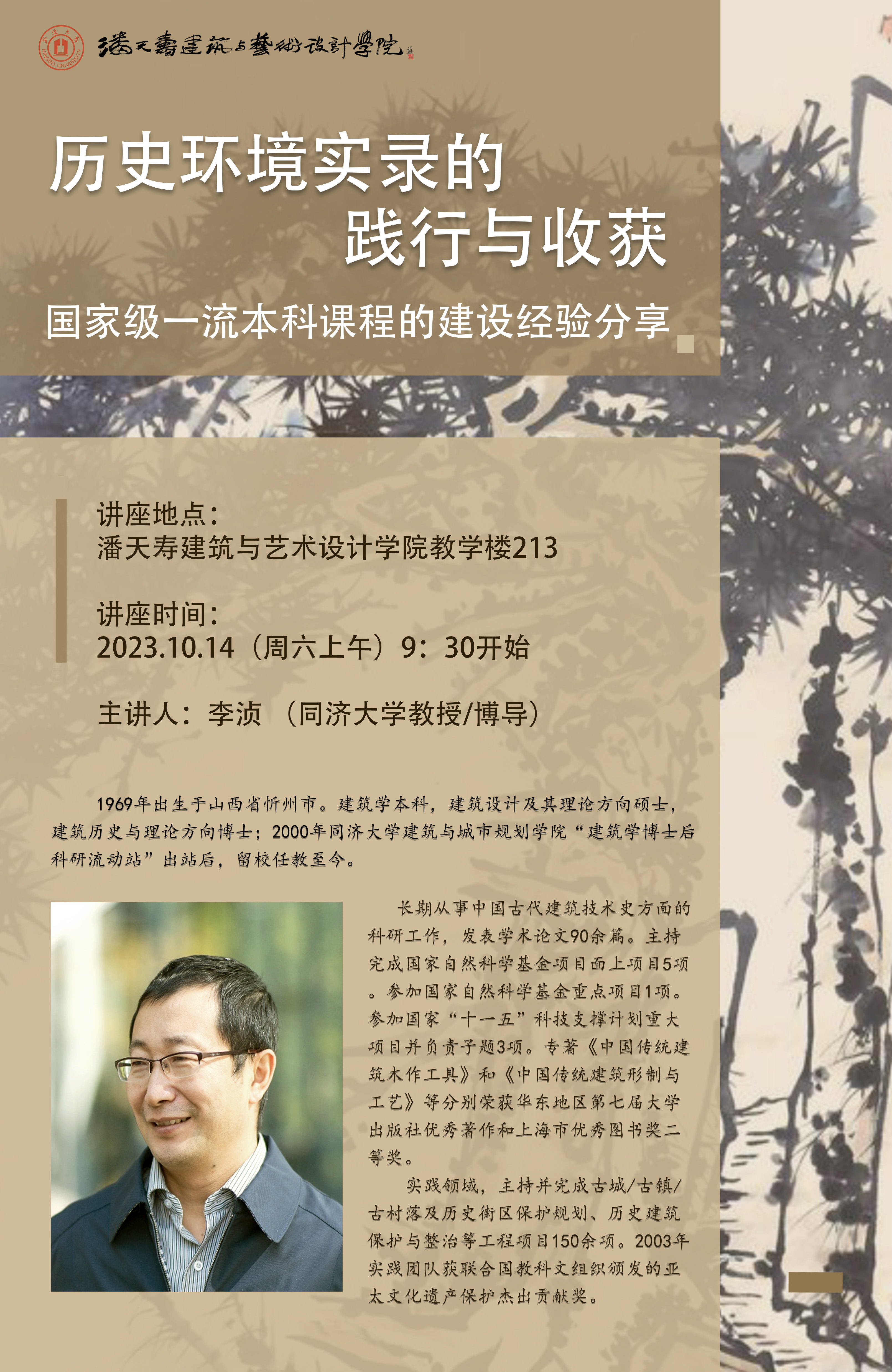 邀请同济大学教授、博士生导师李浈教授在潘艺教学楼213报告厅给师生做了一场精彩的教学成果与建设经验的报告会,报告的题目是《历史环境实录的践行与收获——国家级一流本科课程建设经验分享》。