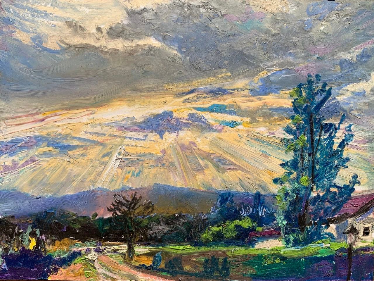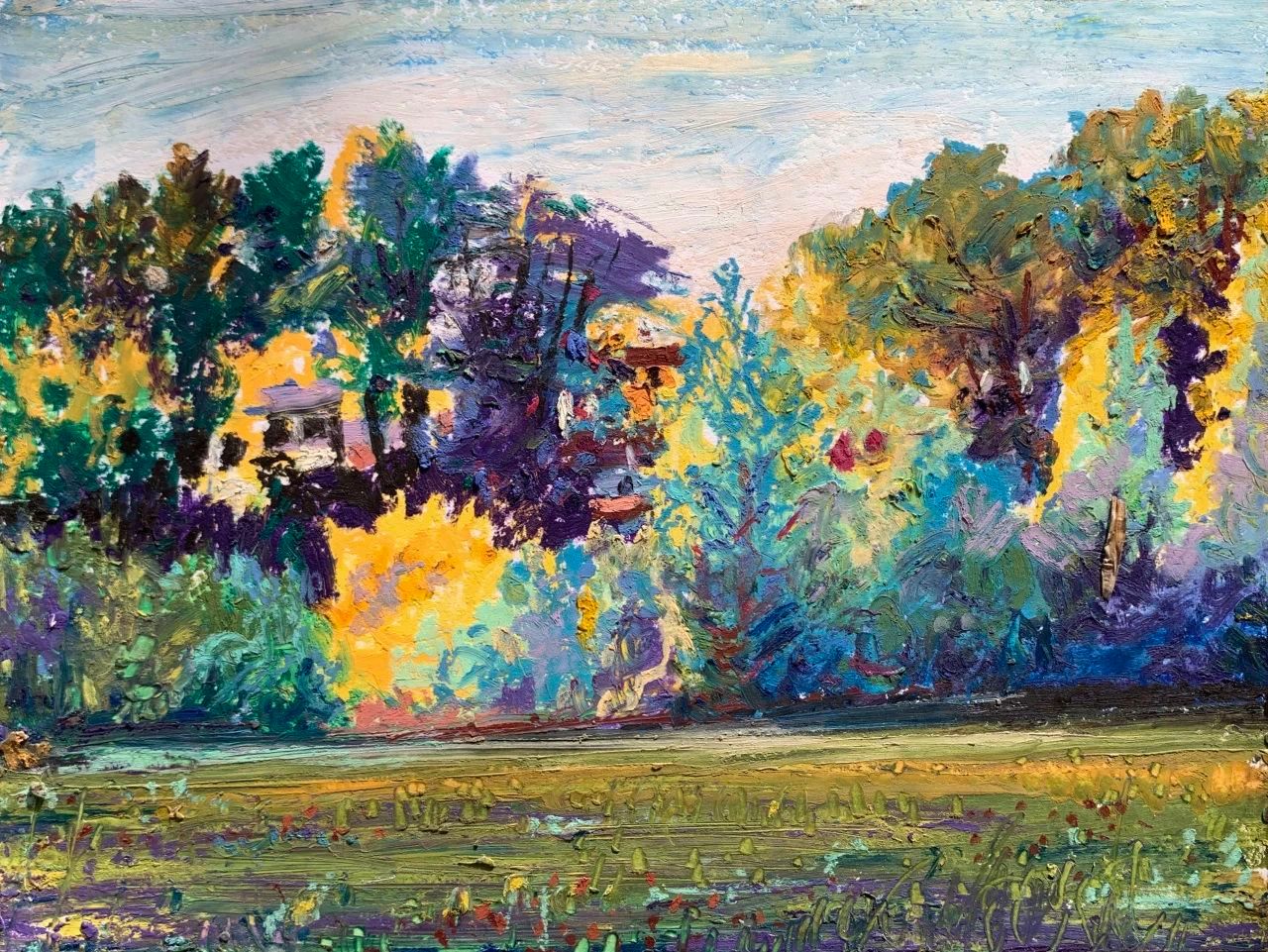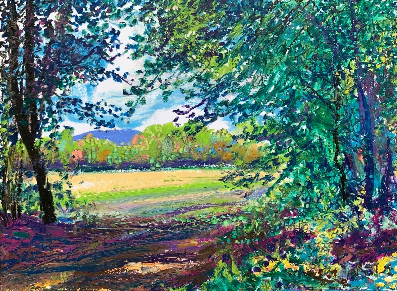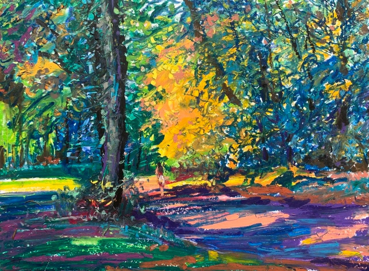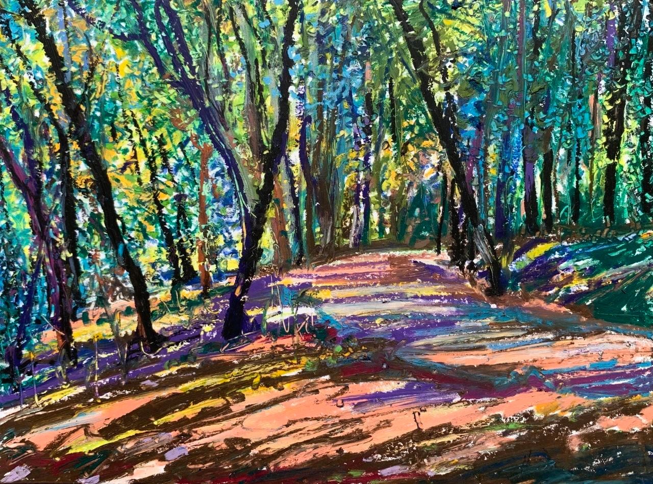 写生让我认识到人类与自然的关系自有一种和谐,人和人的和谐,人和大自然的和谐应当成为一种共存的本质。然而,最终大自然以一种超越人类的方式存在,其所隐含的一切美是人类无法用艺术彻底表现出来的。这是我通过写生深切体会到的一点。尽管如此,我还是愿意让写生成为一种审美生活的方式,让写生成为对我所看到所感受的一切的视觉记录。我时常走到住所附近的树林里去,林间保持自然的原始状态,但是其间有散步小道贯穿,有时围绕着湍急的河流辗转深入,引我一时间走的很远。人们闲暇的时候喜欢在林间散步,呼吸着清新的空气,自在放松。河边的略微开阔的沙滩上也有亲朋或家人或铺布野餐,或沐浴阳光,孩子在河边戏水玩耍。我则寻找着角度,悄悄坐下来描绘眼前的景色,耳边是河流喧哗的声响。阳光照进林间,形成斑驳的光影,幽林树叶的点状明暗色光,与河流声共同构成此时声色光的自然之美。便有了一种闪烁跳跃的音乐质感,仿佛一曲节奏欢快的圆舞曲,让我的眼光也波荡流动起来。
