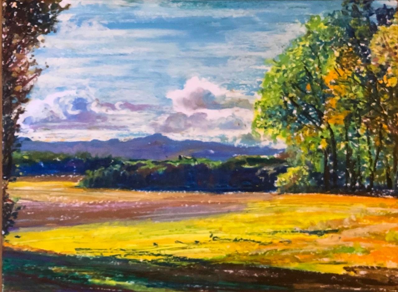 又是一个晴好的天气。我从家门出来,一直走到了田野里,一排树木从草地上延伸到山坡后面,山坡后面有什么我并不知道,云也从坡后面冒出来,朝头顶的天空蔓延开来,云朵就好像雪山一样耸立起来,看上去既柔软又十分洁白,让我很想爬到那上面去。山坡上云的暗影缓缓移动,等我走到山坡上,我看见一条河流在平川处划出一条亮白的细线。仿佛土地裂开了,露出了下面的一面镜子。这镜子从未将我的面孔映射出来,它只映照天空里的一切。山坡下有一群村舍,红褐各色房顶下白墙突出,络绎不绝在草地上,被树林围绕着,周围山坡黄绿相间,单纯而鲜明。这土地是如此肥沃,好像充满了生长的欲望。我走在田野上,麦天的金黄色铺展开来,又很快地收割了,露出土地的颜色,很快又被新的绿色所覆盖。而树木从夏天的浓绿到秋天的红绿褐黄,诉说着自然重复变化的绚烂之美。我曾经在这片麦田边上傻傻地站着,像守望者看着金色的麦海,这样我的站姿就有了稻草人一样的意味。