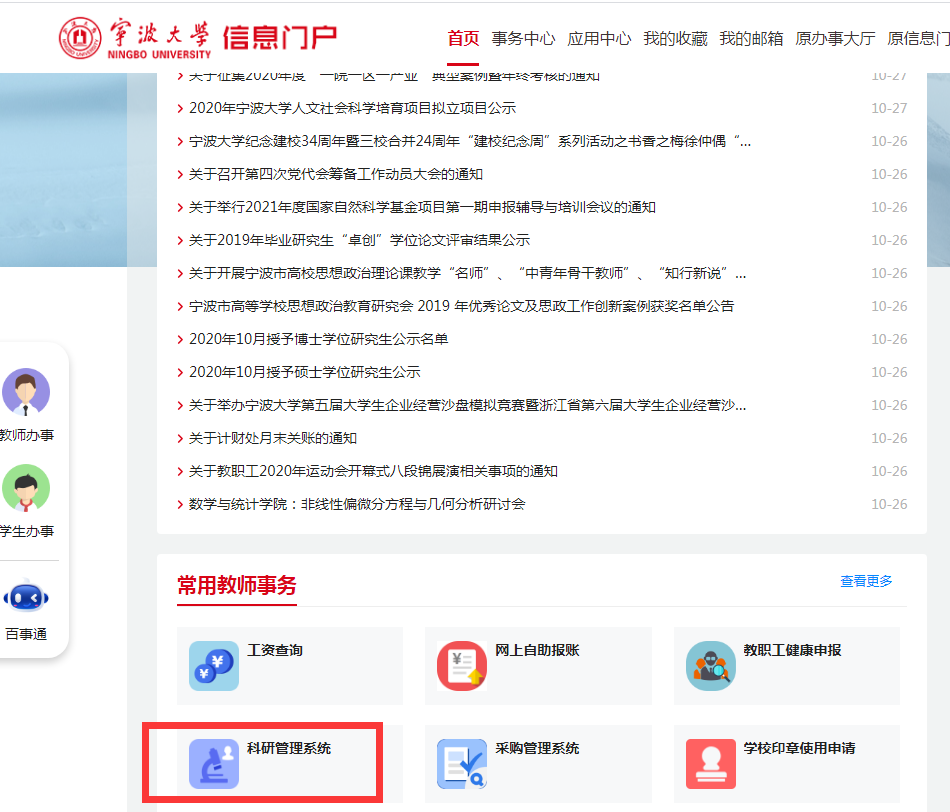 各位教师通过信息门户,统一身份认证登录。在常用教师事务中访问科研服务平台。适合各类主流浏览器访问(IE版本需IE9以上)。