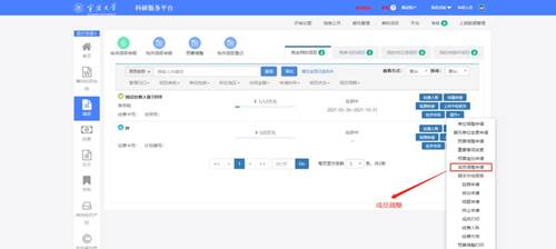 4. 进入项目组成员,请确认成员是否完整。特别是项目中有学生的参与的,请完善学生身份类别。成员信息有问题的,进入科研系统利乐娱乐城,左侧的项目界面,点击操作下拉框下的成员调整申请,进入成员调整界面进行添加和修改,待项目主管审核之后,会自动补充到项目经费公开一览表,最后再提交即可。
