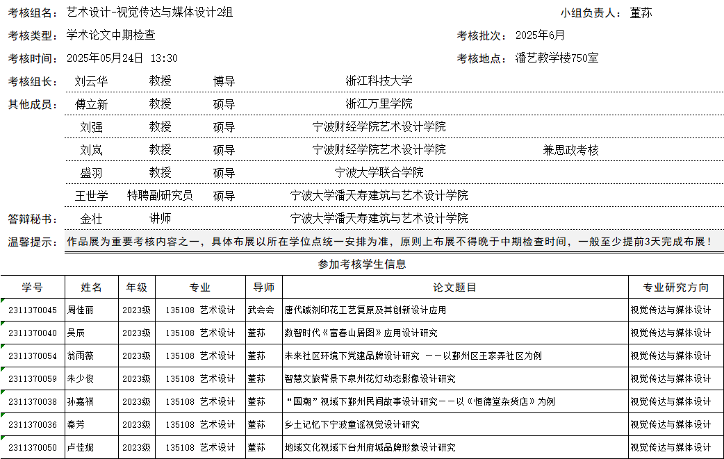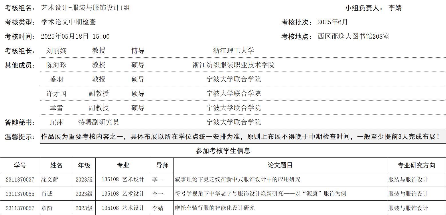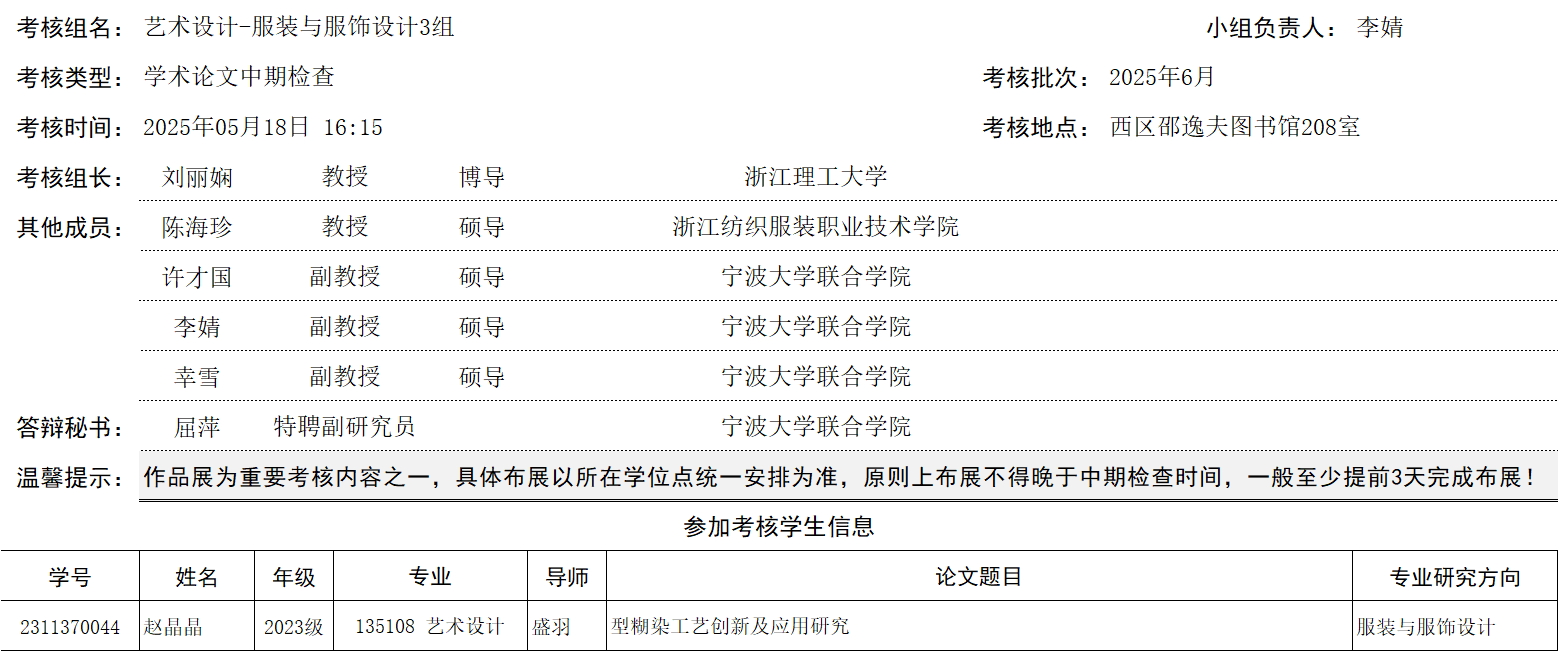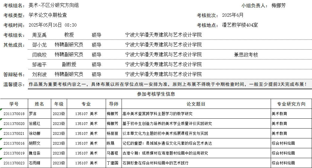 校级通知中期检查组织要求、检查内容、处理办法详见《关于开展2023级研究生学位论文中期检查的通知》(//graduate.lileyulecheng8.com/info/1025/23660.htm)