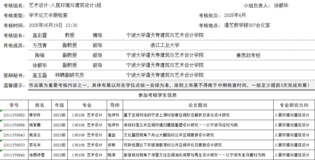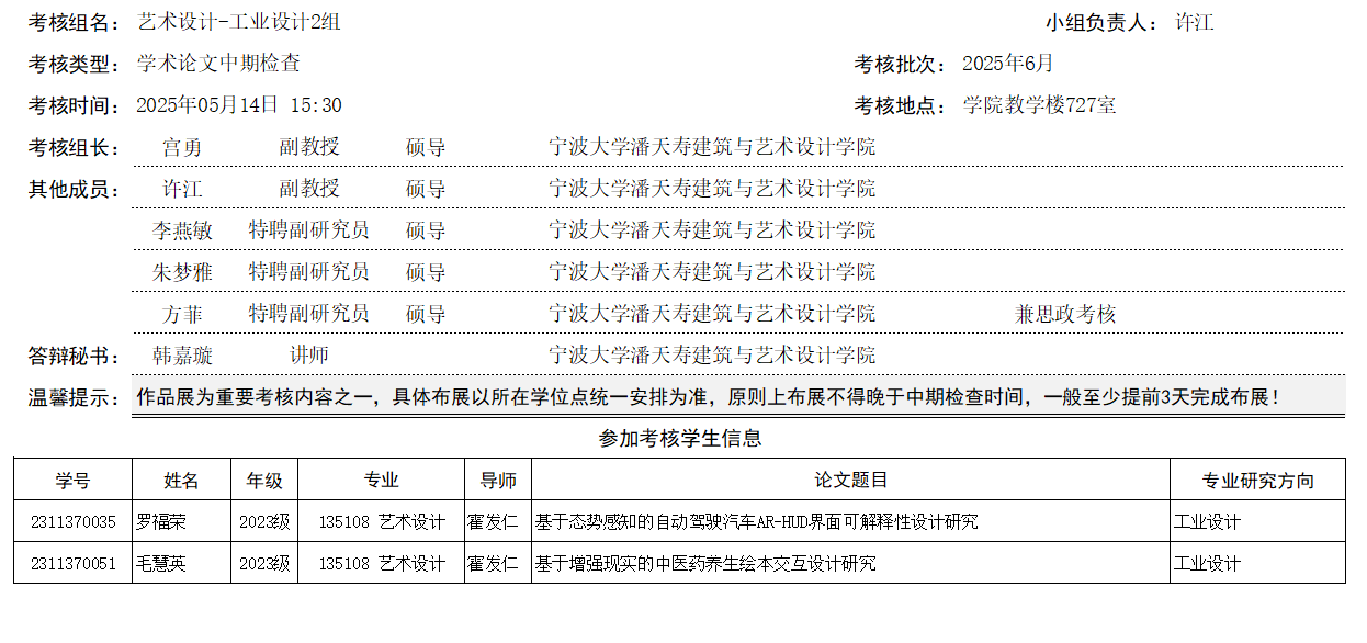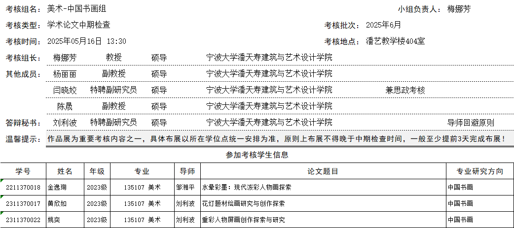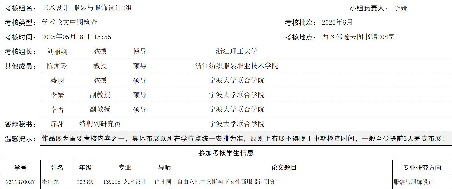 校级通知中期检查组织要求、检查内容、处理办法详见《关于开展2023级研究生学位论文中期检查的通知》(//graduate.lileyulecheng8.com/info/1025/23660.htm)