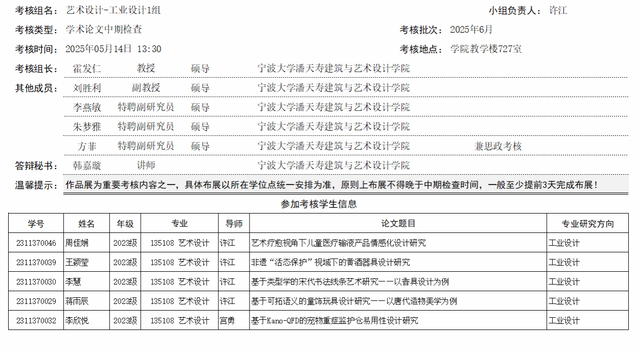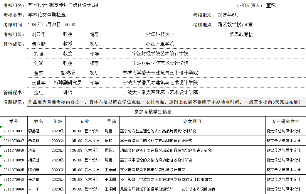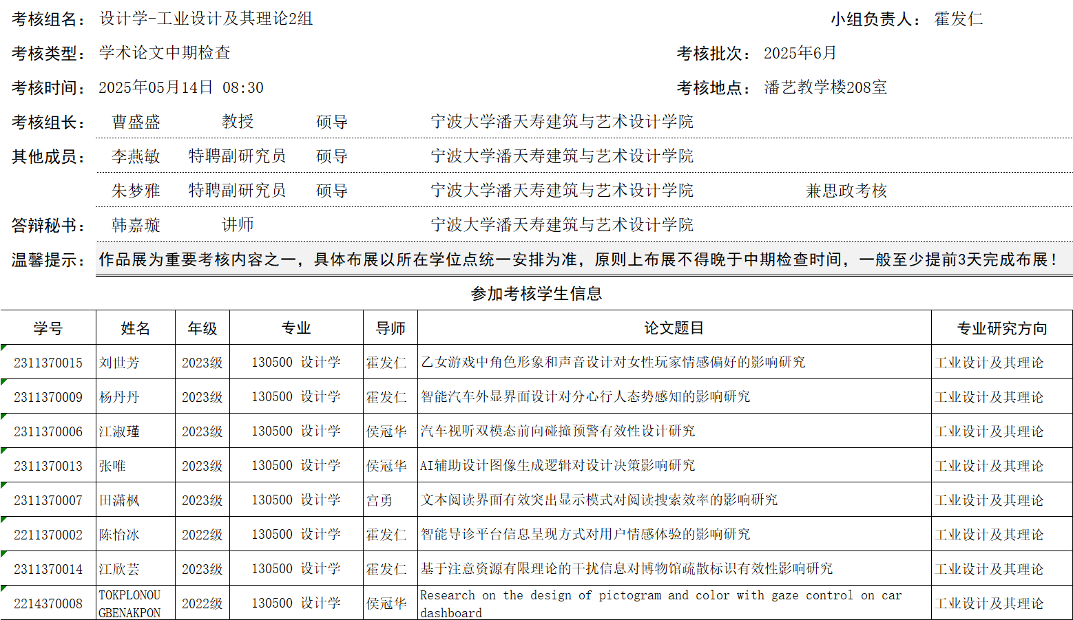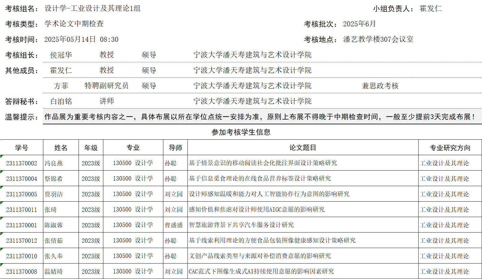 参加答辩学生须于2025年5月9日11点前完成《研究生培养工作工作日志本》、《研究生学位论文中期检查表》( 纸质材料及电子材料,内含决议表和答辩记录表)、投票表(1张汇总+7张投票表,信息填写完整),检查表按要求装订,材料统一由班长代收。