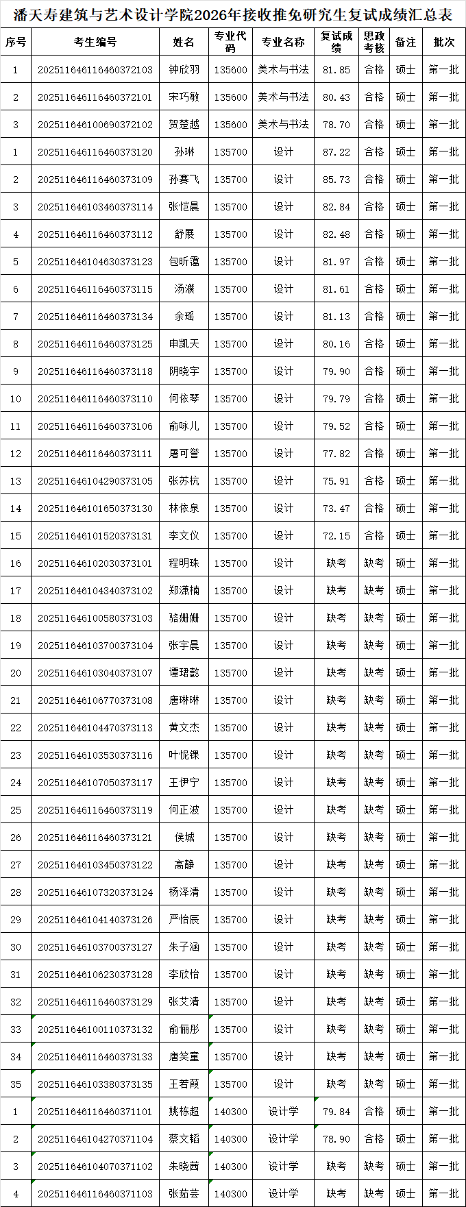 潘天寿建筑与艺术设计利乐娱乐城网 2026年接收推免研究生复试成绩汇总表(第一批)