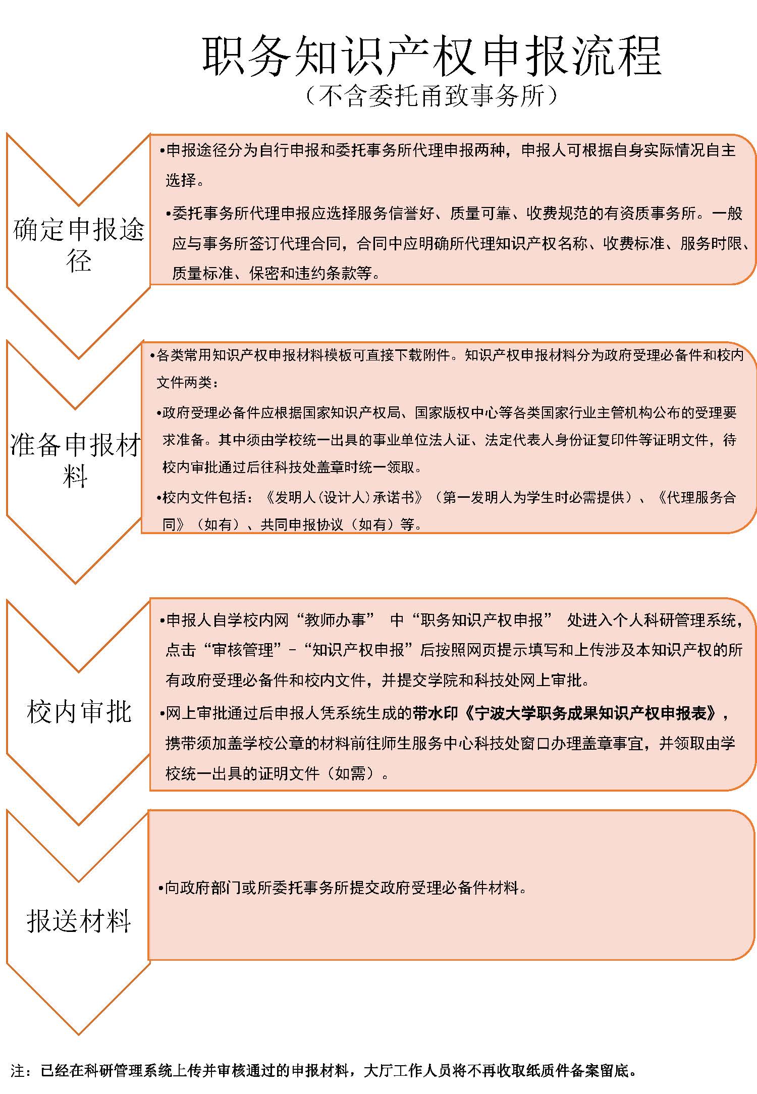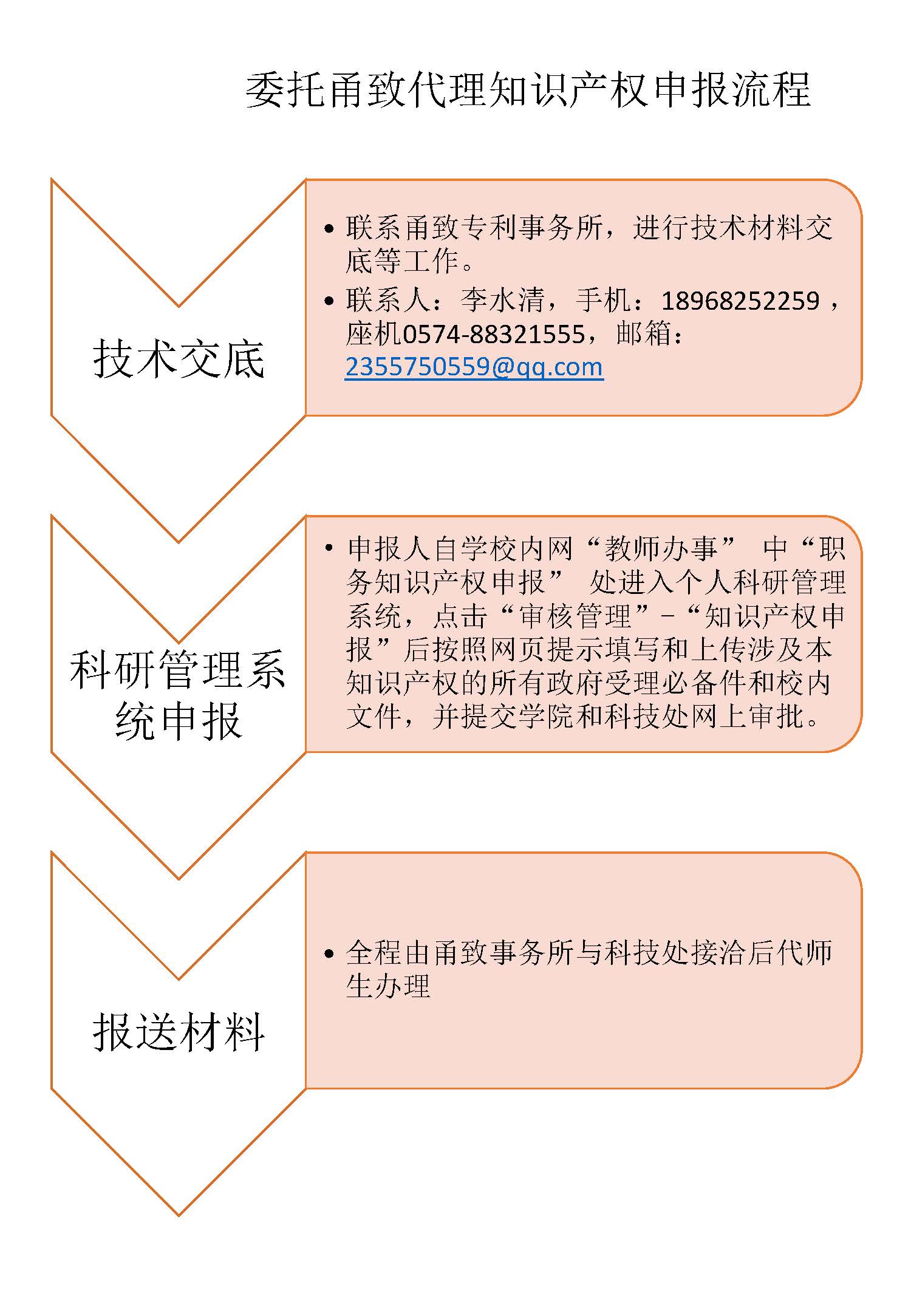 (3)凡选择宁波甬致专利代理有限公司进行代理申报的各类知识产权,自科研管理系统审核通过以后,所有知识产权申报材料盖章(包括盖校章)、报送国家有关部门、材料归档等事宜皆由甬致专利代理有限公司与科技处接洽后代为办理,实现师生跑零次。具体办事流程见附件图。